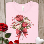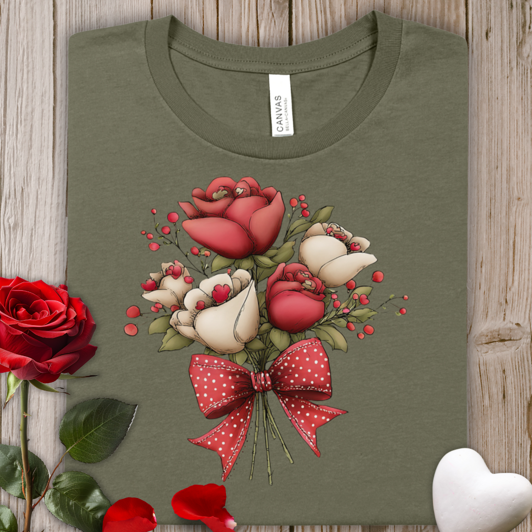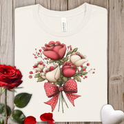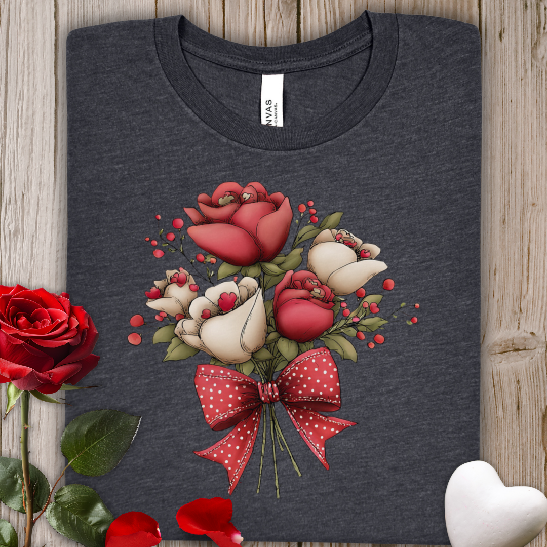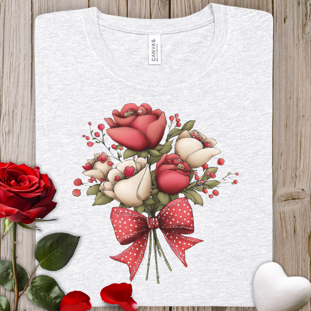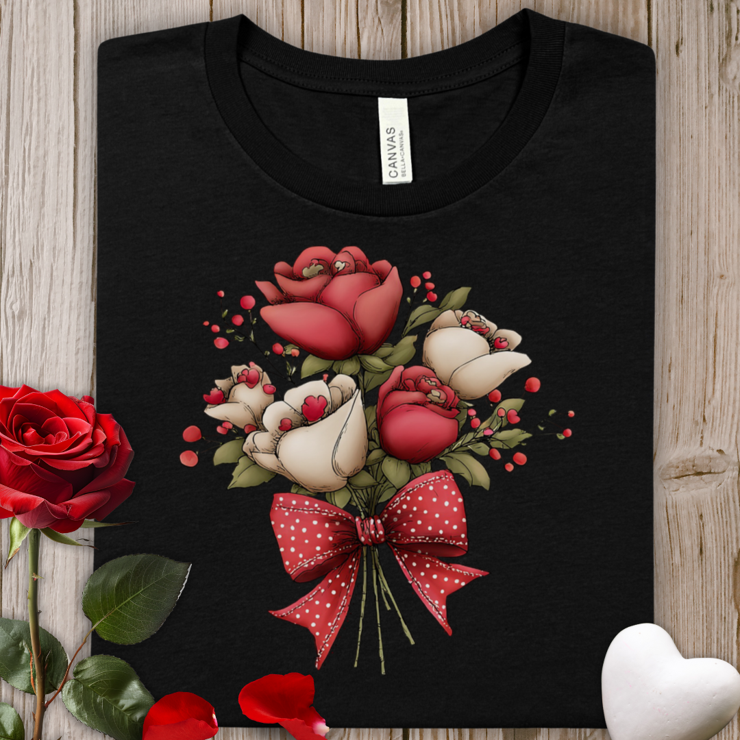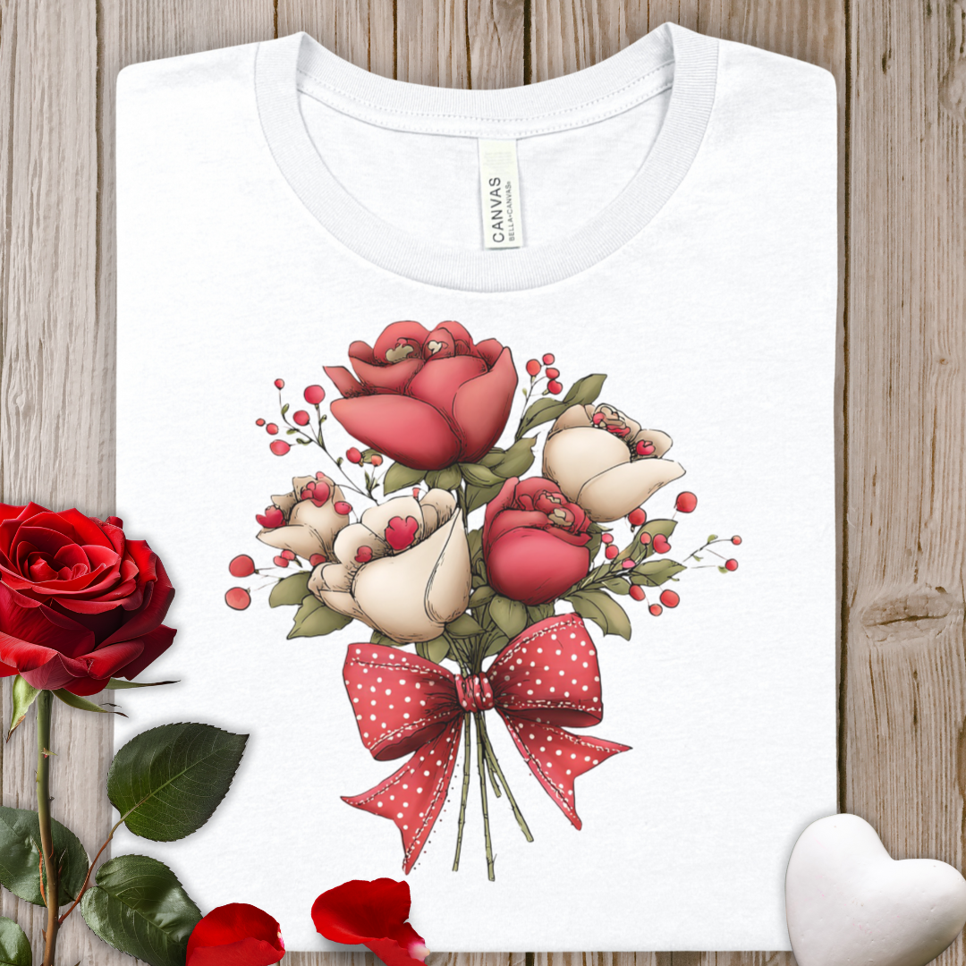 Floral Rose Valentine's Bouquet Tee — Red & Cream Roses with Polka Dot Bow