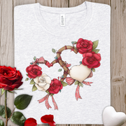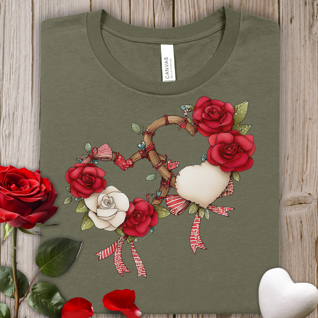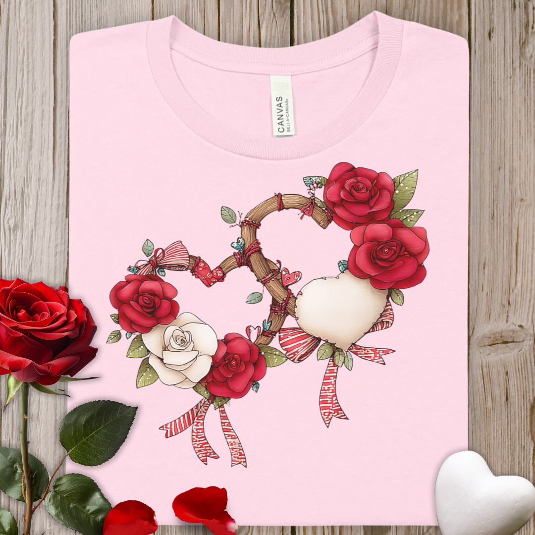 A soft, breathable cotton tee that carries a quiet, romantic story. Two rustic heart wreaths woven from twigs sit side-by-side on a clean background, tied with gingham ribbons and dotted with rich red and creamy white roses. Wear it on slow mornings with coffee, at a backyard picnic, or layered under a jacket for an evening walk. The lightweight fabric and classic crew neckline keep the feel relaxed and effortless while the floral-heart motif brings a gentle, handcrafted touch to everyday outfits. It settles into the wardrobe like a familiar memory—comfortable, thoughtful, and a little bit sentimental.