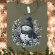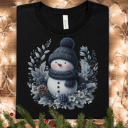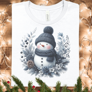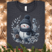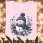 Soft, breathable tee with a gentle winter illustration that feels like a quiet snowfall captured on fabric. The shirt shows a sweet, rosy-cheeked snowman nestled in frosted foliage — calm blues, muted grays, and warm accents give it a cozy, hand-painted look. Wear it layered under a cardigan for slow weekend mornings, or pair it with jeans for a relaxed holiday stroll. The lightweight cotton keeps you comfortable indoors by the fire or outside on a crisp day, while the crew neck and retail fit keep the silhouette tidy and easy to style. This shirt whispers winter charm without shouting — a subtle, seasonal piece that blends with homey moments and low-key seasonal gatherings.