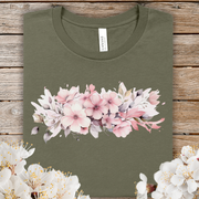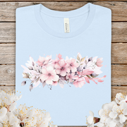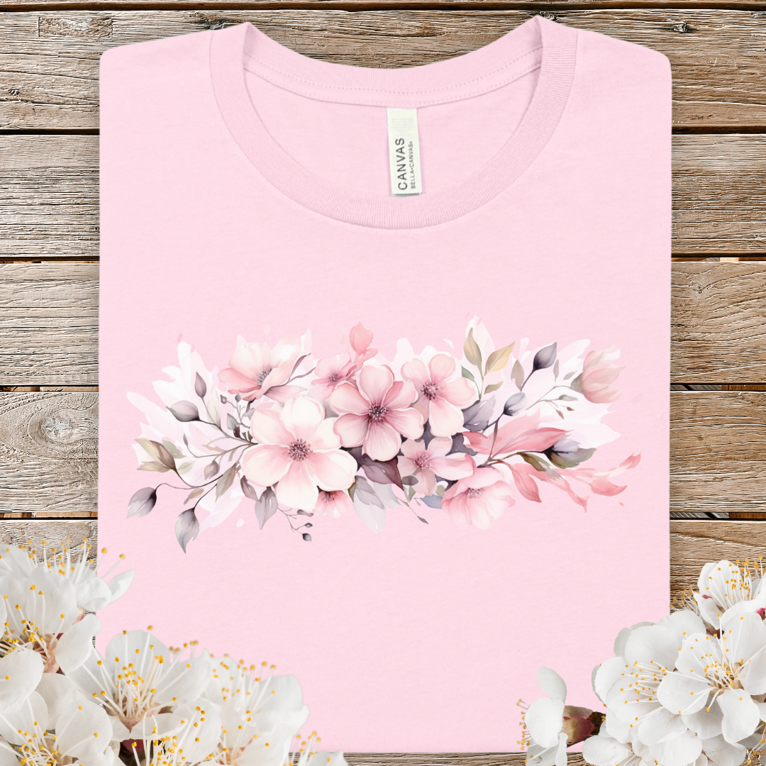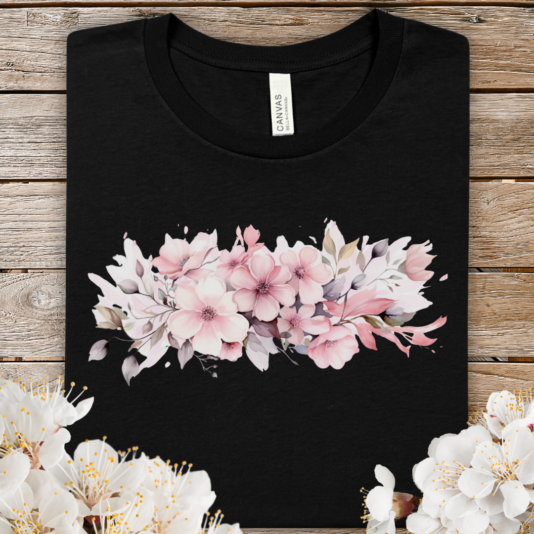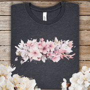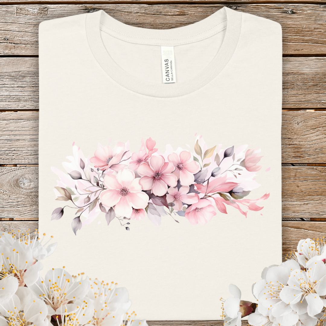 This lightweight jersey tee carries a soft, airy presence—like the first warm day of spring pressed into fabric. A delicate spray of watercolor-style pink blossoms floats across the chest, the subtle greens and mauves blending into the white background for a calm, natural look. The retail cut and crew neckline keep the silhouette neat and easy to layer under jackets or over tanks. Wear it to slow morning coffees, strolls through neighborhood gardens, or quiet afternoons with friends—the floral detail reads gentle and modern rather than fussy. Thoughtful construction (side seams, ribbed collar with seam, shoulder tape) keeps the fit steady through repeated wear and washing, while the Airlume combed ring-spun cotton feels soft against the skin. Ethically produced and REACH certified, this tee is made with mindful sourcing and a tear-away label to reduce irritation. If you want a simple floral statement that blends everyday comfort with a soft, botanical mood, this tee sits naturally in that wardrobe.