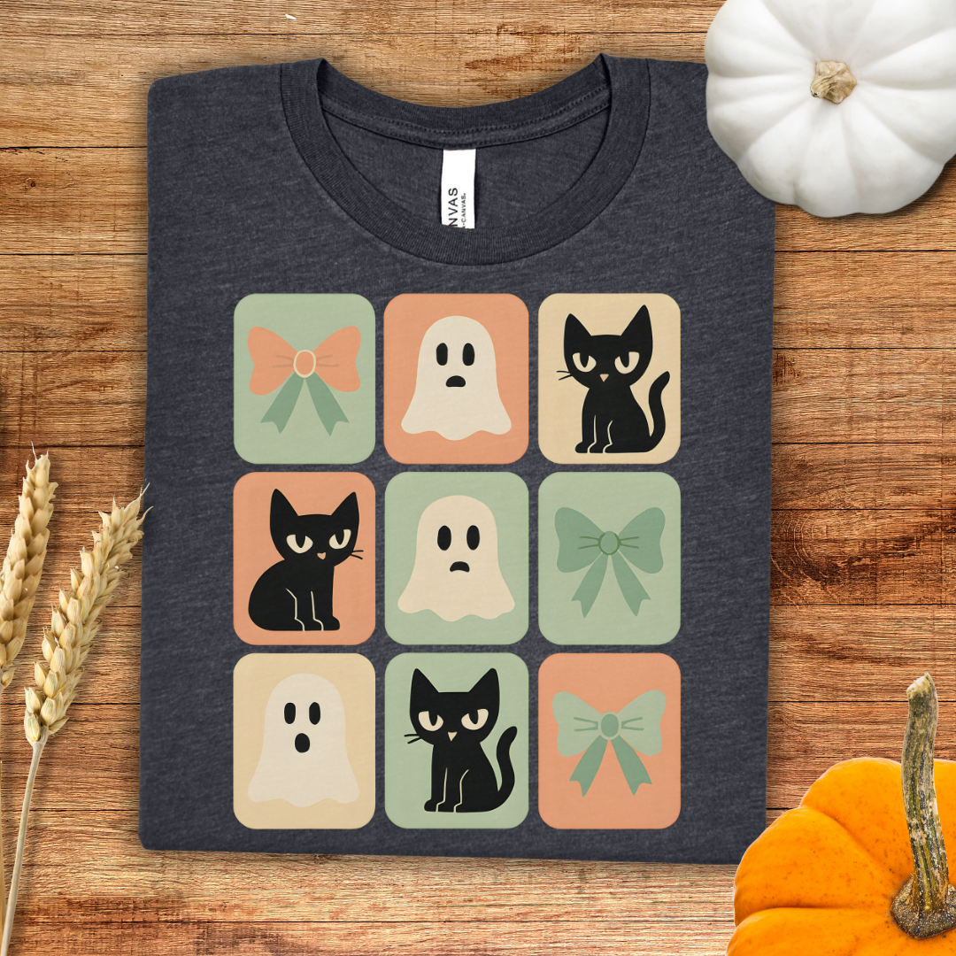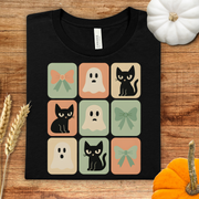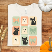 Cute Halloween Cat, Ghost and Coquette Bow T-Shirt