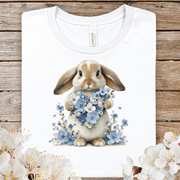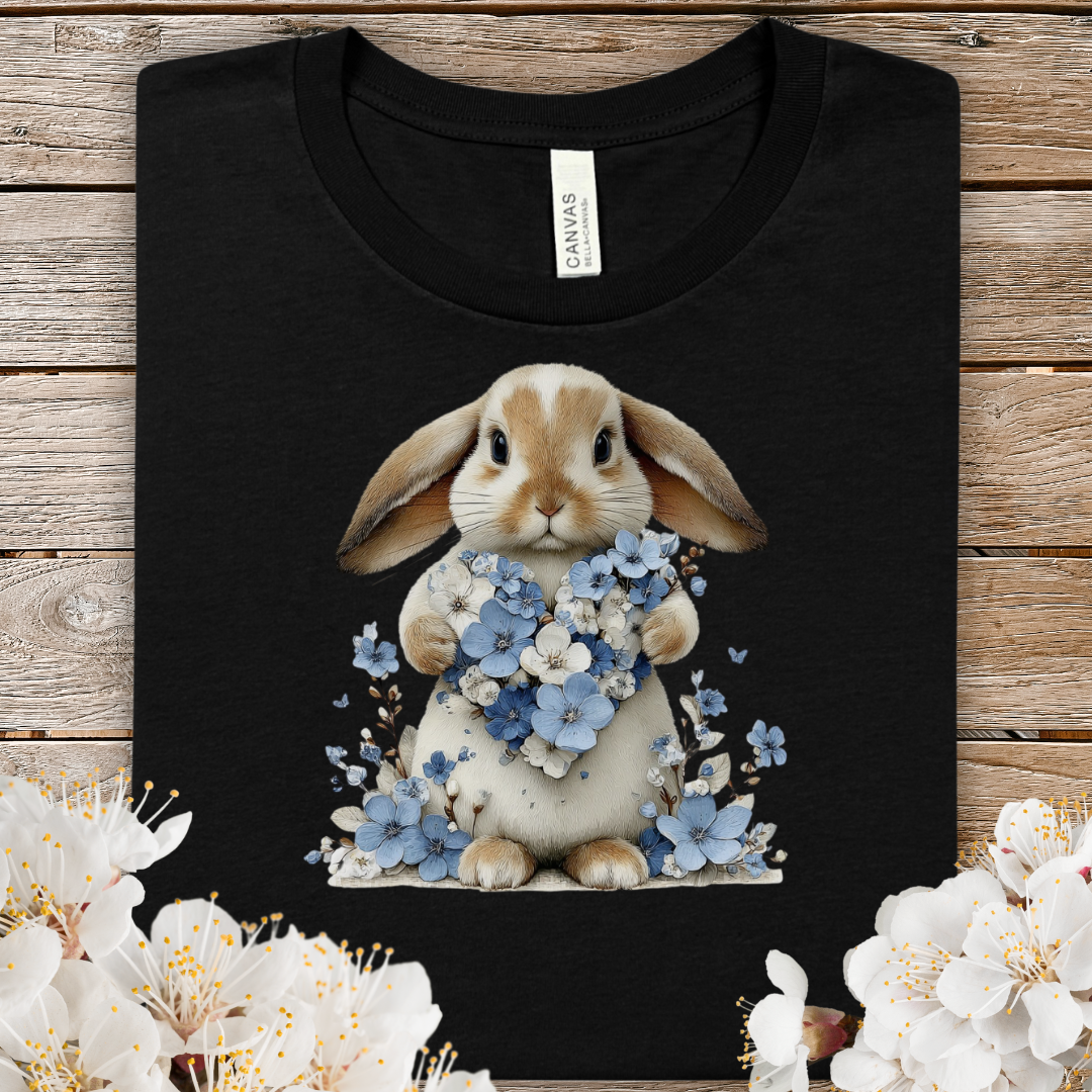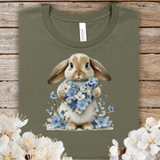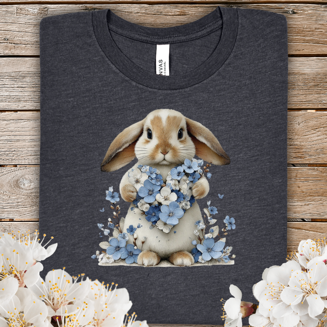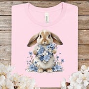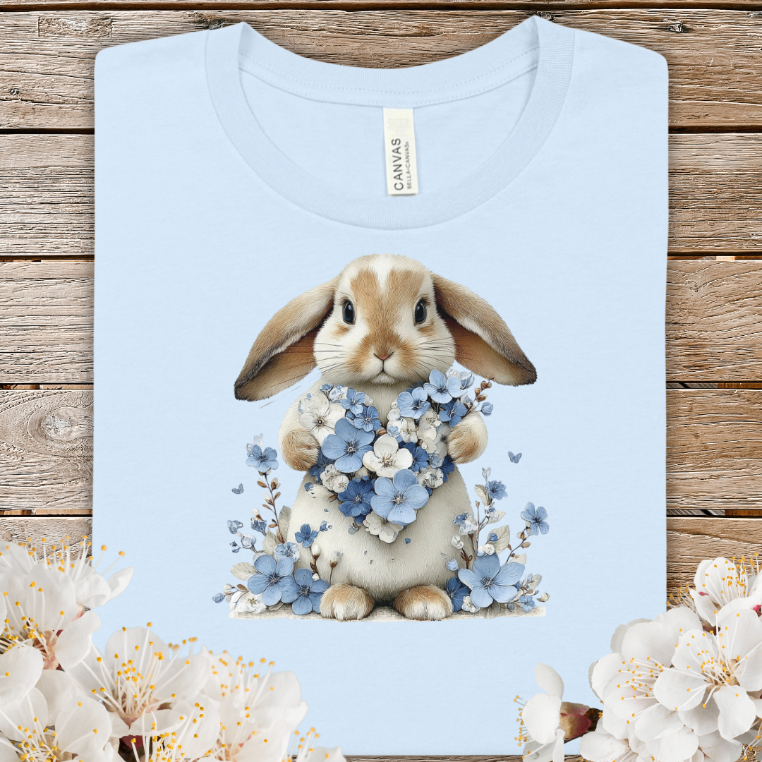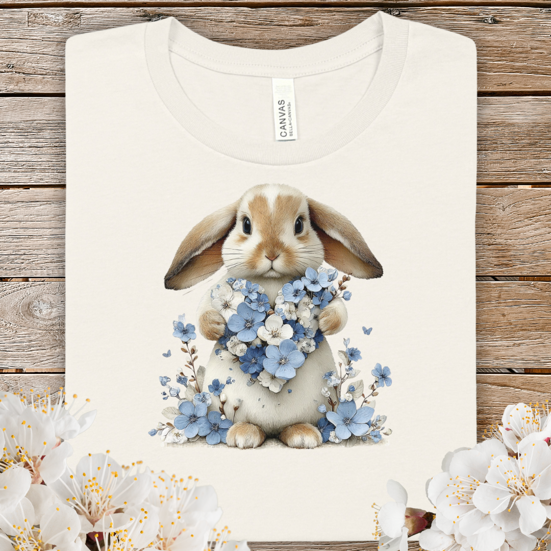 Soft, light, and quietly charming — this short sleeve tee lets a gentle spring moment live on your chest. A sweet brown bunny cradles a cluster of pale blue blossoms, rendered with soft shading and delicate detail that reads like a watercolor kept close. The breathable Airlume combed cotton feels cool against skin, while side seams and a ribbed crew collar keep the silhouette neat through everyday movement. Wear it on slow mornings with jeans, layered under a cardigan for an afternoon market, or folded into a weekend travel kit for cottage stays — it brings a calm, tender note to whatever you do.