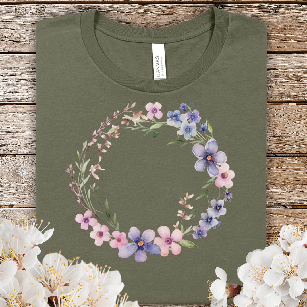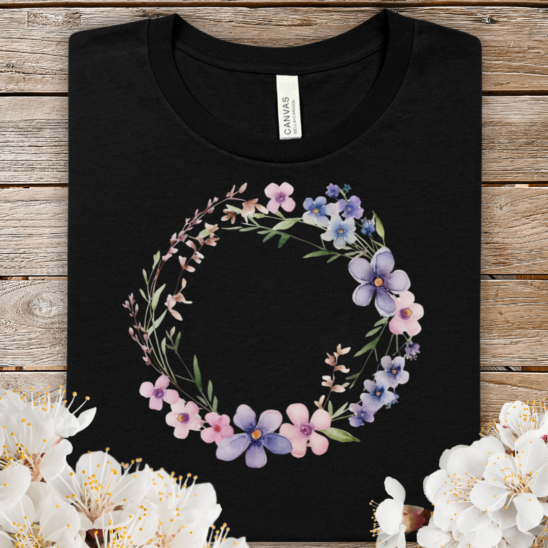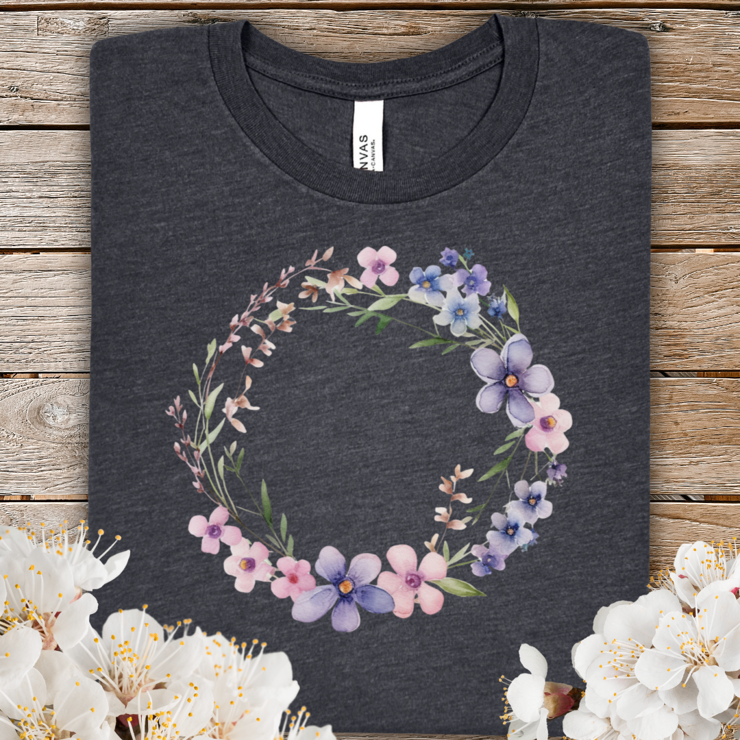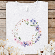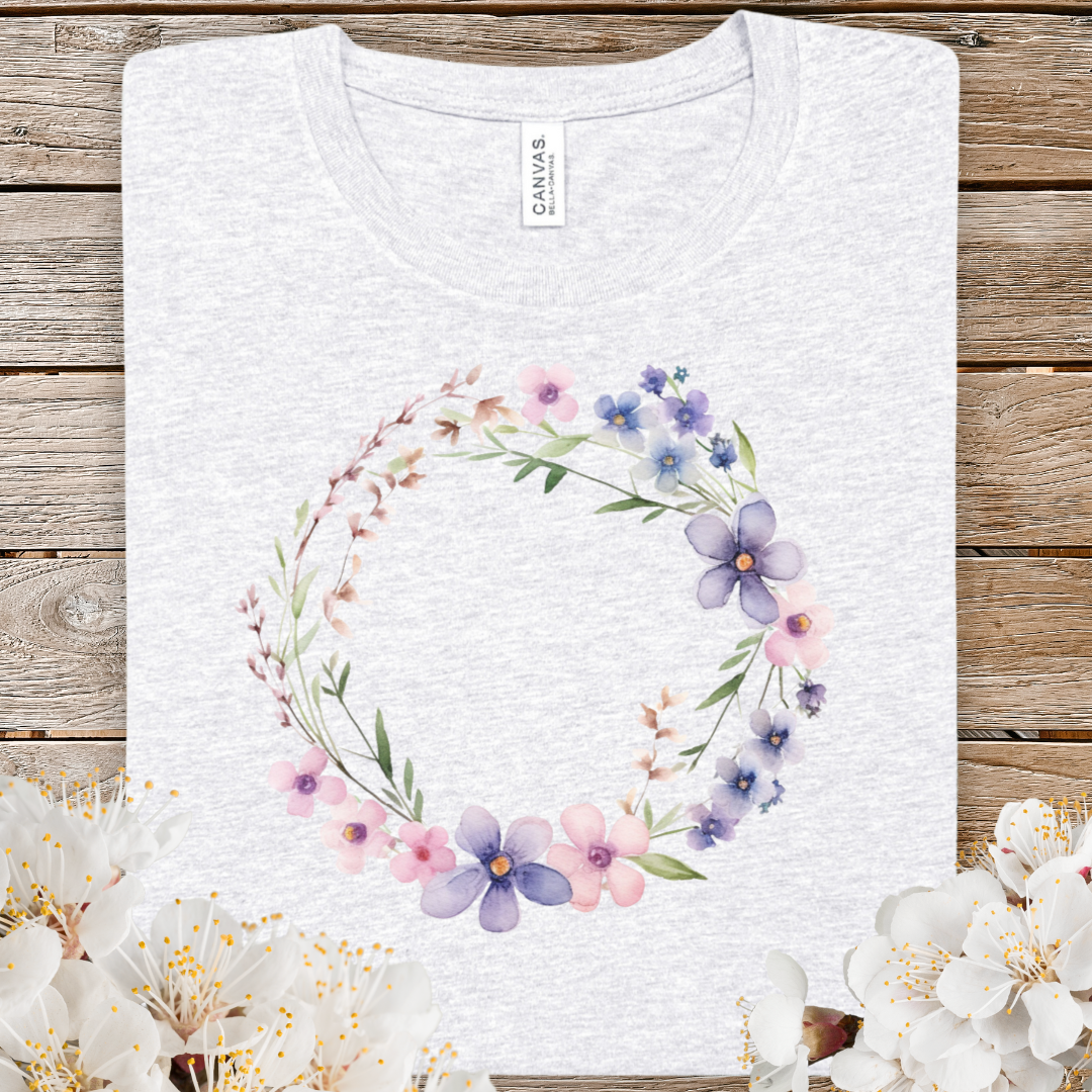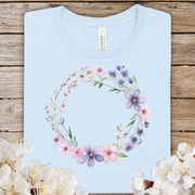 Spring Watercolor Floral Wreath Tee — Pastel Purple & Pink Flower Circle T-Shirt