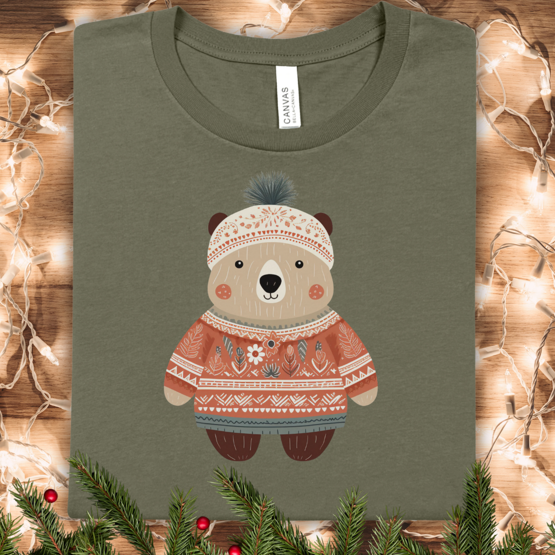 Bear in Cozy Sweater T-Shirt — Cute Winter Woodland Graphic Tee