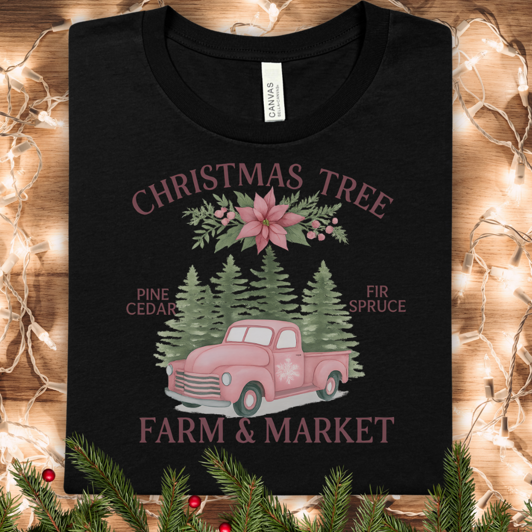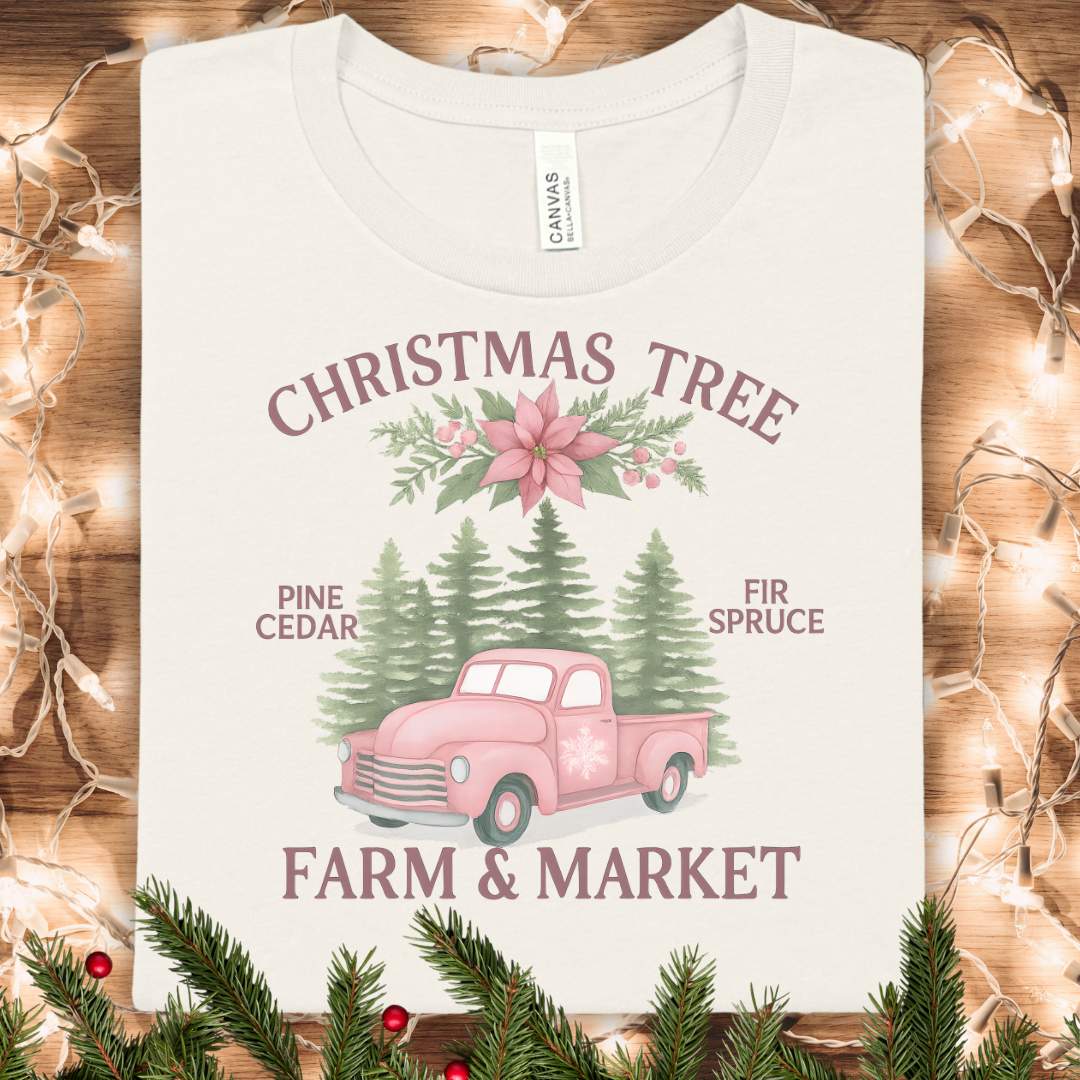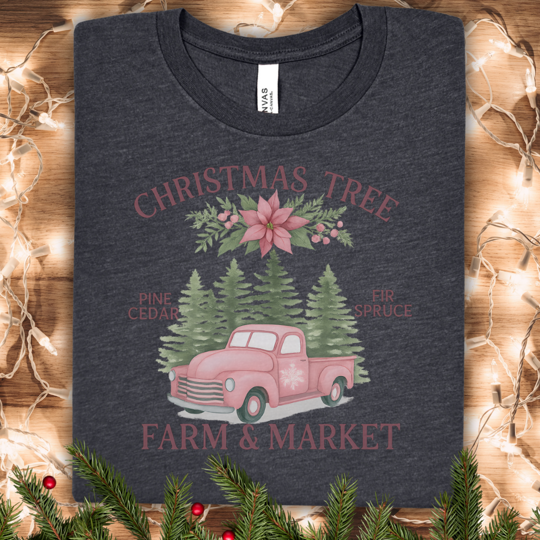 Christmas Tree Farm & Market Tee — Pink Truck Holiday T-Shirt