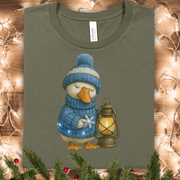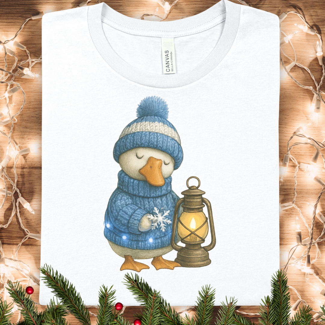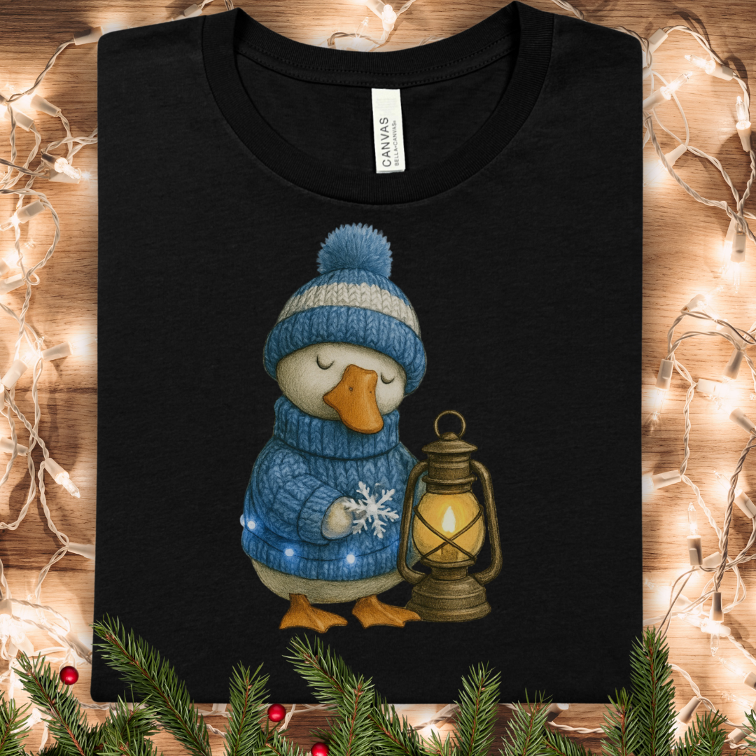 A soft, lightweight tee that carries a quiet winter story. The front shows a cozy, goose illustration — bundled in a blue pom-pom hat and sweater, cradling a warm lantern. The image feels hand-painted, with gentle textures and a muted palette that sits calmly on the chest. Wear it on slow evenings by the fire, during neighborhood holiday strolls, or layered under a coat for weekend markets. Breathable Airlume cotton keeps you comfortable whether you’re chasing the last daylight or sipping cocoa under string lights. The retail crew neckline and neat silhouette let the artwork be the focus while staying easy to style with denim or a flannel shirt.