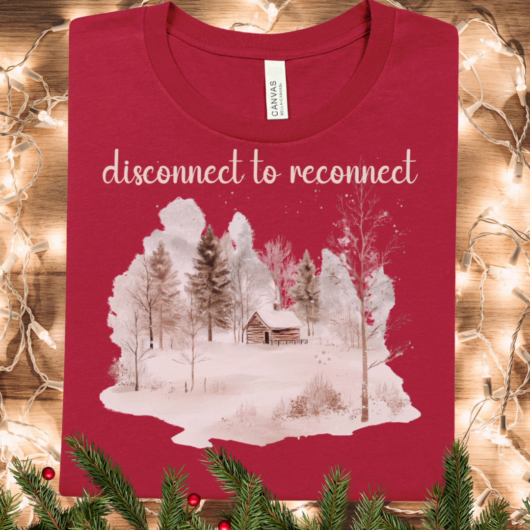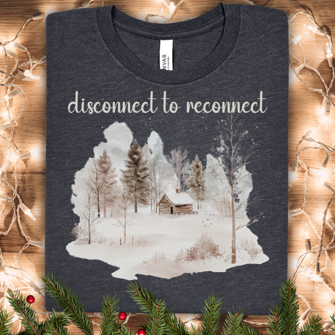 Disconnect to Reconnect Watercolor Winter Cabin T-Shirt
