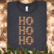 Soft, breathable tee with a playful holiday print that feels like a cozy kitchen full of fresh-baked treats. The stacked “HO HO HO” letters wear a warm, hand-decorated gingerbread pattern — swirls, icing dots, and tiny candy details that read like a sweet, nostalgic moment. Lightweight cotton drapes easily under a cardigan or on its own during a chilly parade, and the clean crew neckline keeps the look tidy and easy to accessorize. Wear it to slow mornings with cinnamon coffee, to casual family gatherings, or while wrapping gifts and listening to crackling holiday playlists — it brings a cheerful, homey energy without shouting for attention.