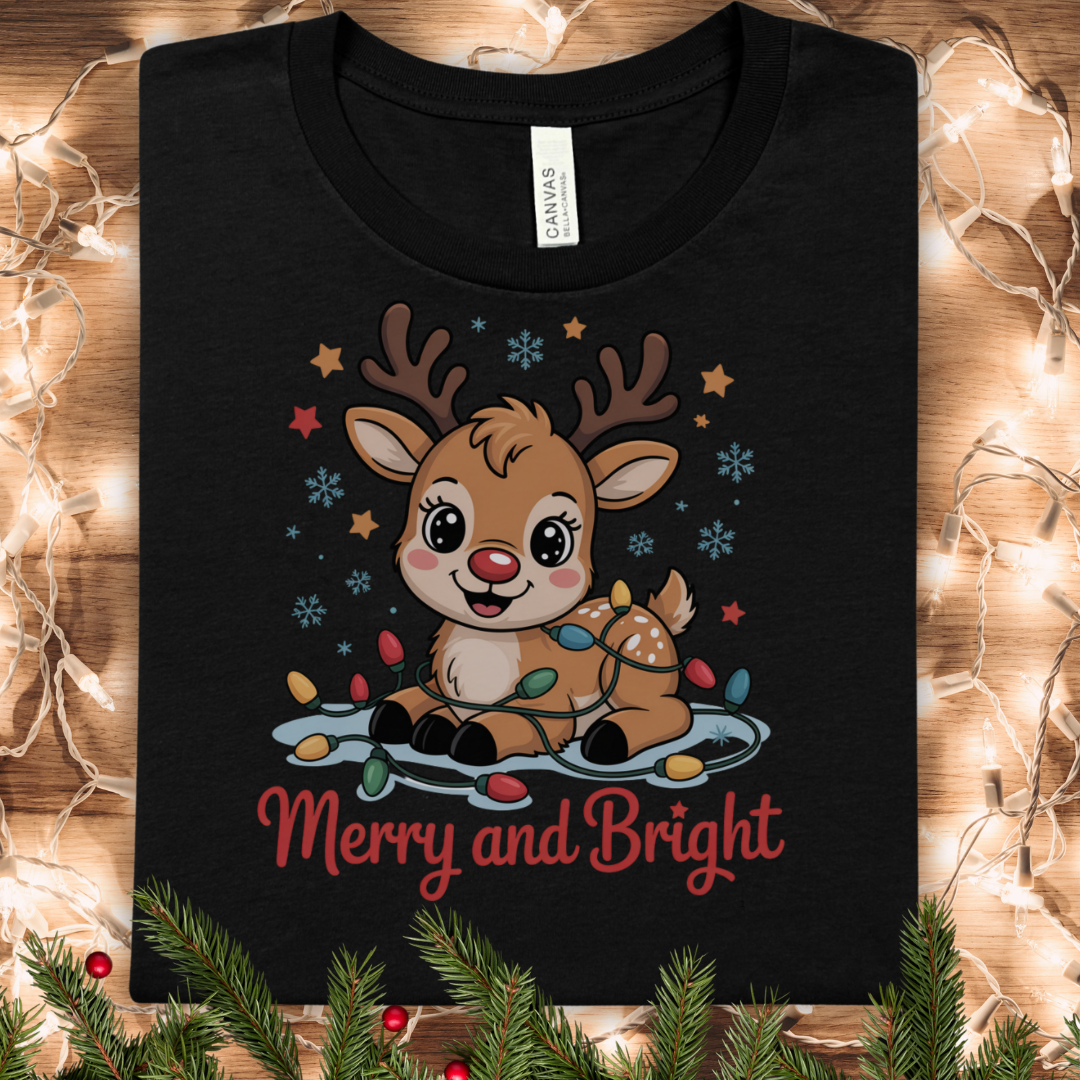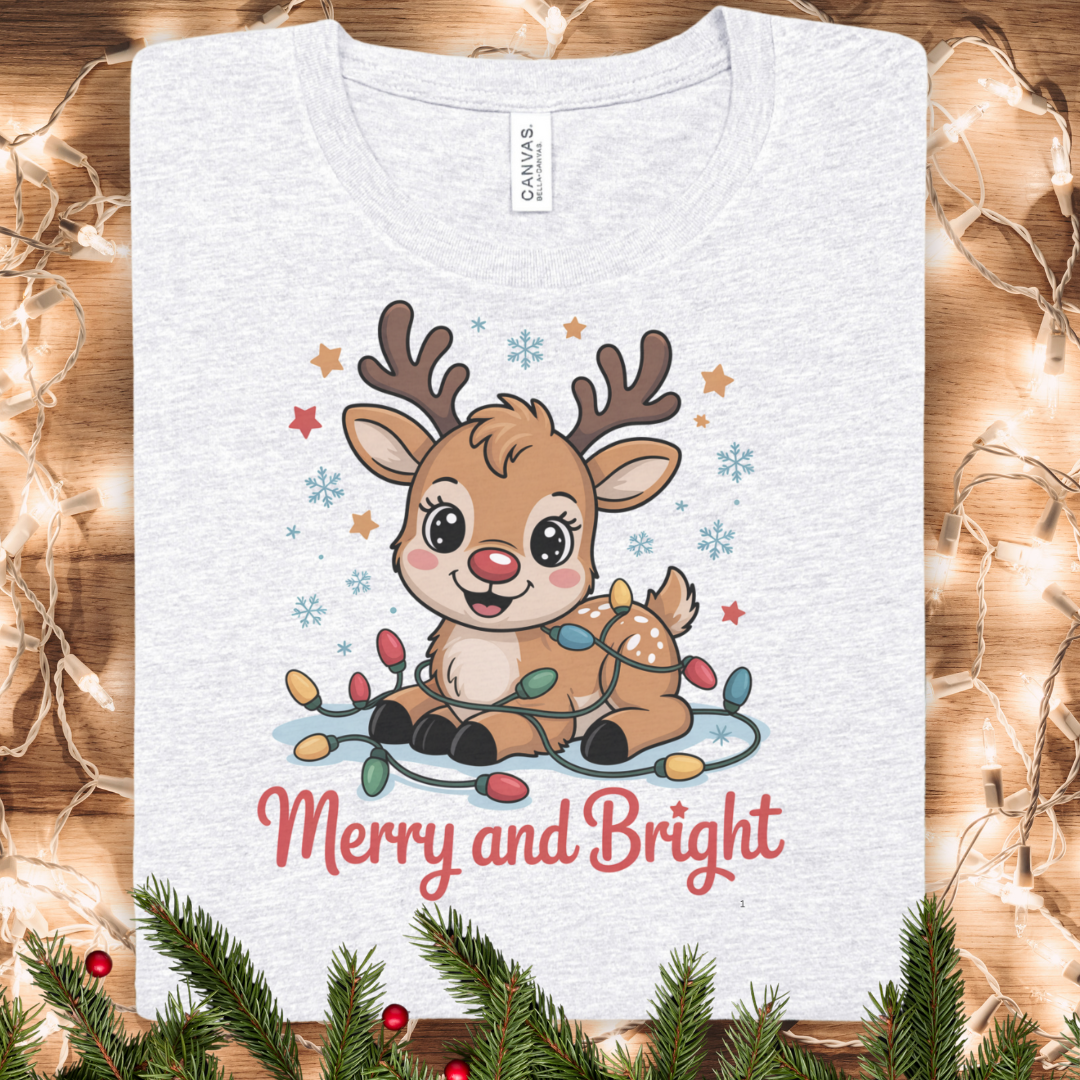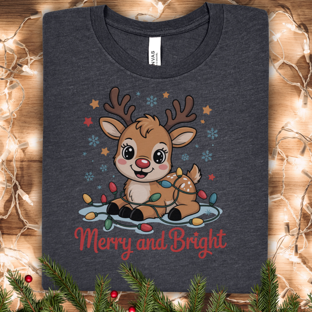Soft, lightweight, and happily festive — this jersey tee carries a cheerful little reindeer wrapped in twinkling holiday lights and snowflakes. The illustration reads “Merry and Bright” in warm script, giving a playful, cozy vibe that slips easily into holiday mornings, family photos, or relaxed evenings by the tree. Breathable Airlume cotton keeps things cool under layers while the clean crew neckline and retail fit let you dress it up with a cardigan or keep it simple with jeans. It feels like that gentle, laugh-filled moment when the house glows from string lights and everyone’s in pajamas — familiar, bright, and a bit magical.