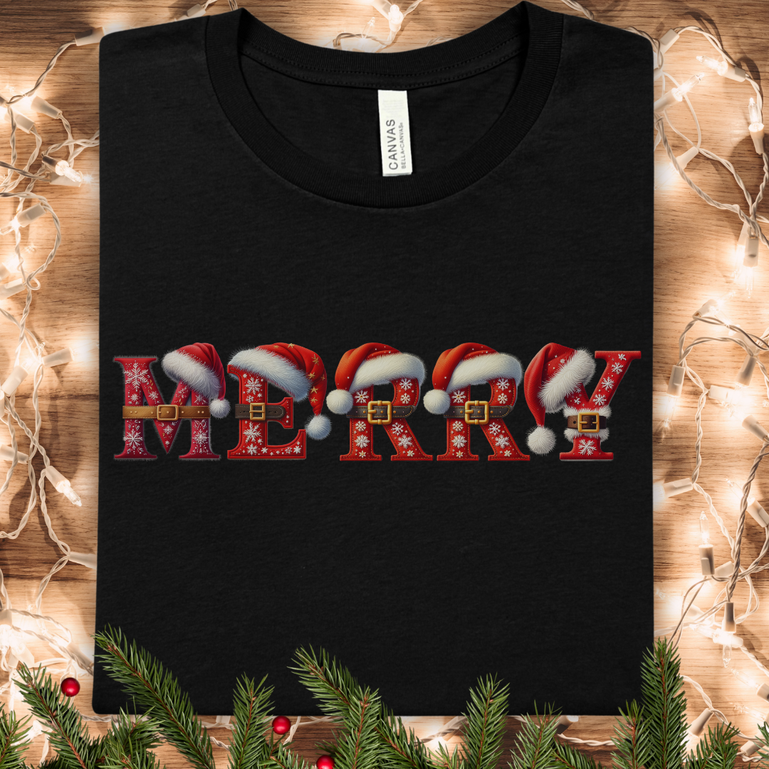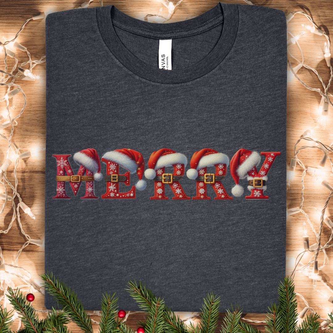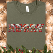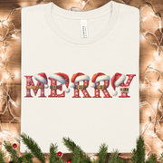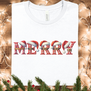 Lightweight and breathable, this cotton tee wears like a warm memory: the chest reads “MERRY” in a cozy, festive pattern—candy canes, holly, and threadlike stitching peeking through each letter. It sits clean and classic across the shoulders, with a neat crew neckline and side seams that keep the shape wash after wash. Slip it on for neighborhood caroling, casual holiday markets, or a relaxed evening by twinkling lights. The look is familiar but fresh—seasonal without shouting, and easy to layer under cardigans or over long-sleeve tees when the air turns crisp.