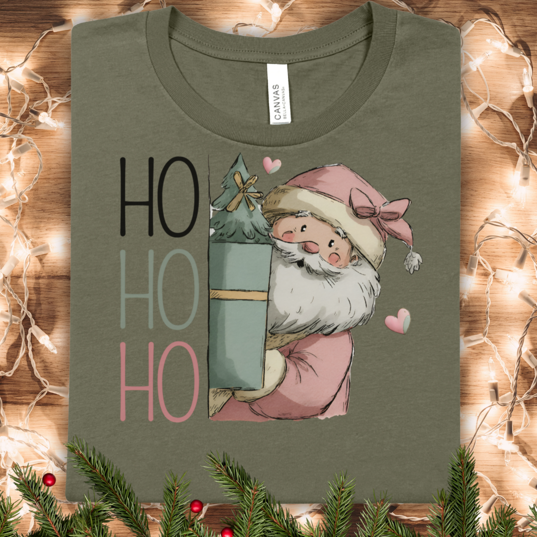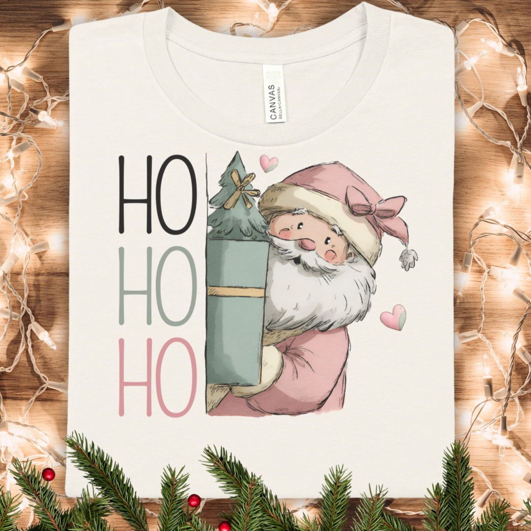 Soft, cozy, and quietly festive — this lightweight tee brings a gentle, vintage-style Santa to slow mornings and holiday runs. The muted pinks and teal gift box feel like a cozy whisper of yuletide, while the simple “HO HO HO” lettering keeps the design playful without shouting. Wear it layered under a cardigan for a relaxed holiday brunch, or alone while wrapping gifts and sipping cocoa. Breathable Airlume cotton feels smooth against the skin. The retail crew neck and neat fit let you accessorize with scarves or statement earrings for seasonal gatherings, and the subtle design sits comfortably in both everyday and holiday moments.