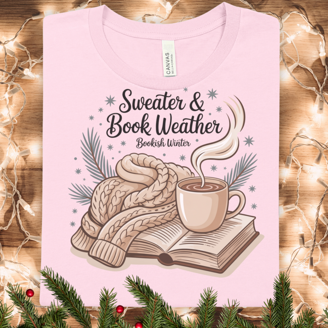 Sweater & Book Weather Winter T-Shirt — Cozy Reading Tee with Mug & Knit Sweater Design